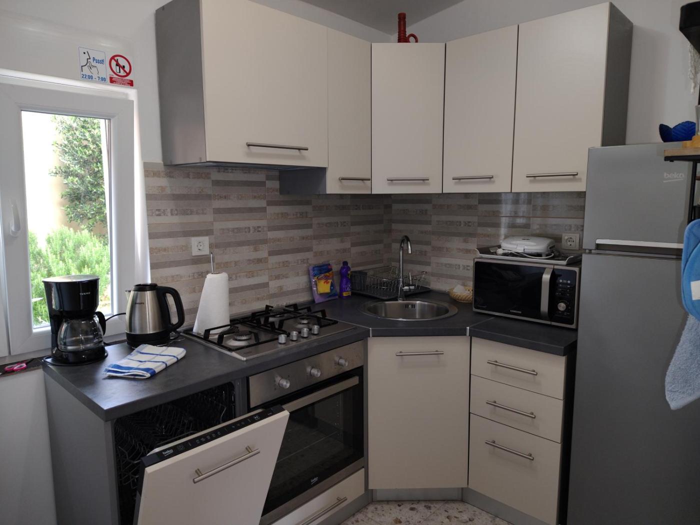Two-Bedroom Apartment. Featuring a private entrance, this air-conditioned apartment consists of a kitchen, 2 bedrooms and 1 bathroom with a shower and a hairdryer. Guests can make meals in the kitchen that is equipped with a stovetop, a refrigerator, a dishwasher and kitchenware. Boasting a terrace with sea views, this apartment also provides a washing machine and a flat-screen TV with cable channels. The unit offers 2 beds.